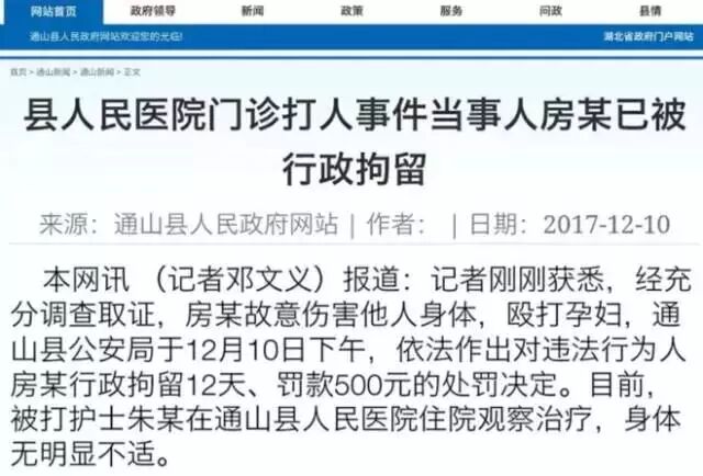 最新消息,倍受舆论关注的“城管局长妻子殴打怀孕护士”事件,湖北省咸宁市通山县政府第3次对外发布通报:经充分调查取证,房某故意伤害他人身体,殴打孕妇,通山县公安局于12月10日下午,依法作出对违法行为人房某行政拘留12天、罚款500元的处罚决定。