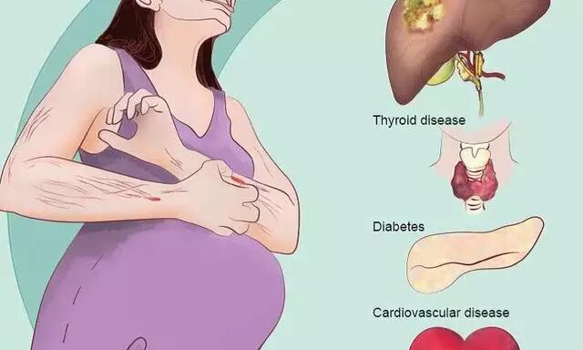 需要提醒孕妈妈的是,肝脏疾病也会引起皮肤瘙痒。不少孕妈妈在妊娠中晚期出现皮肤瘙痒,瘙痒程度各不相同,可以从轻微偶然的瘙痒直到严重的全身瘙痒,个别甚至可发展到无法入眠的程度,其中以手心、足心瘙痒比较典型,也可以有腹部和四肢瘙痒。有些老年人认为这是“胎气”,无关紧要。其实这可能是一种被称为妊娠期肝内胆汁淤积症的妊娠并发症表现。这个疾病对胎儿影响较大,可发生胎儿窘迫、妊娠晚期不可预测的胎儿突然死亡、新生儿颅内出血、新生儿神经系统后遗症等。
