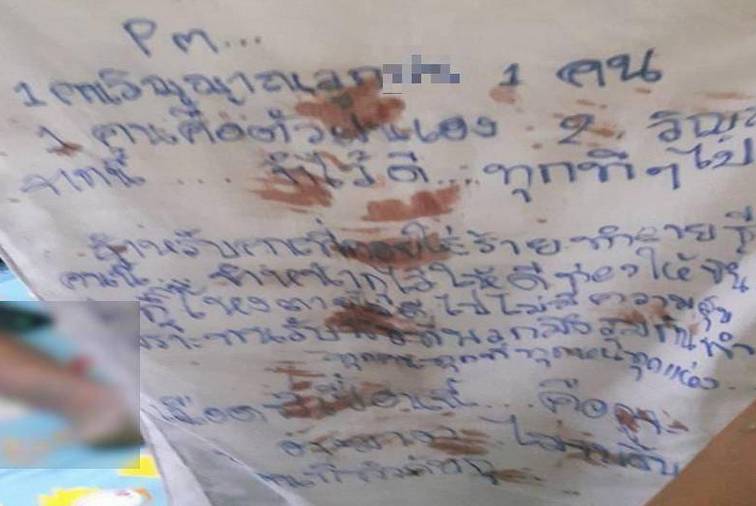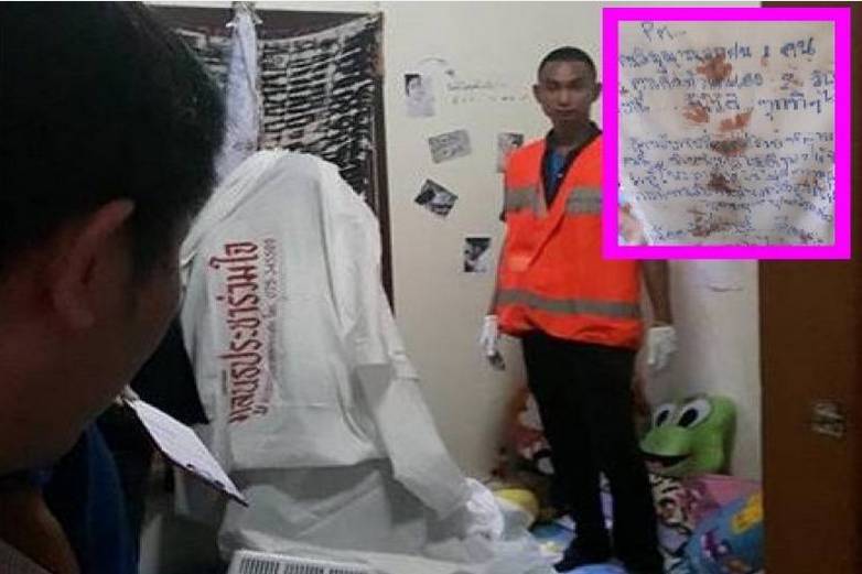 本报讯 昨(25)日呵叻府直辖县警署接到报案称,当地一名孕妇在家中上吊自杀,并写下血书恐吓男友及其家人不得好死。警方联合救援队火速赶往现场调查。警方抵达案发现场时,女子所住房间已经被反锁,警方破门而入发现门后还被钉上十多个铁钉,警方在房内发现怀孕女子的尸体。