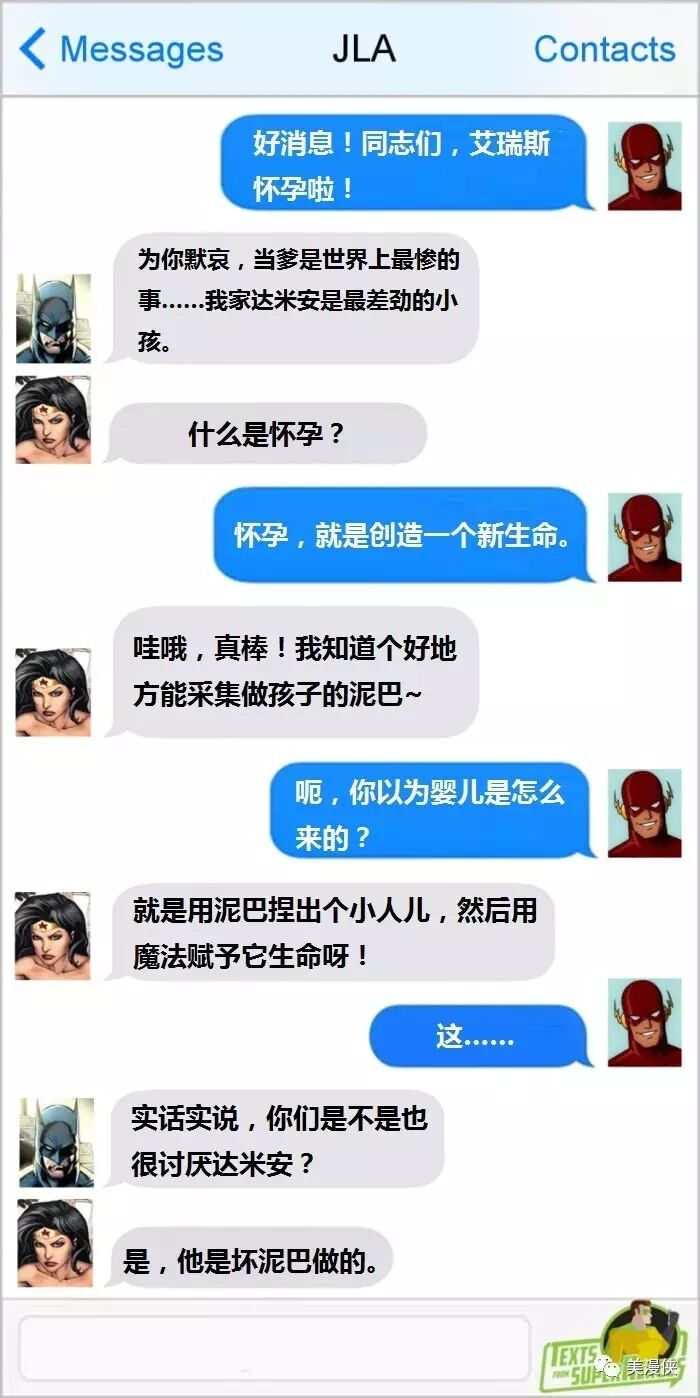 两则正义联盟短信对话,第一张是当闪电侠告诉大家艾瑞斯怀孕了。