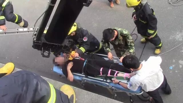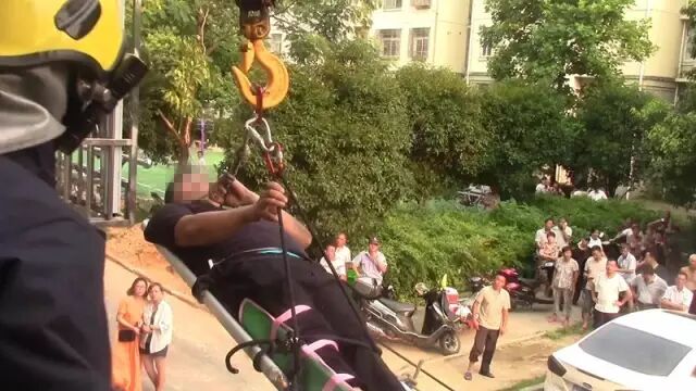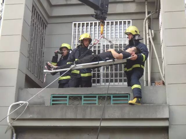 男子被困的2楼平台距离地面3、4米左右,救援人员爬到2楼时,发现男子的右腿已经受伤,动弹不得。经过近20分钟的救援,男子被成功抬了下来,并送往医院治疗。