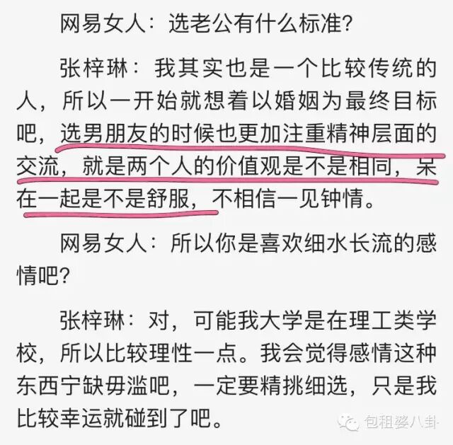 之前张梓琳接受采访时谈到自己的择偶观时,她说选男友更加注重精神层面的交流,更看重两人价值观是不是相同,呆在一起是不是舒服,更喜欢细水长流的感情。