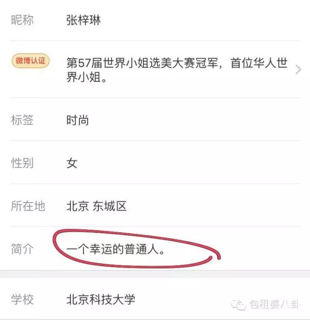到现在,张梓琳微博的简介还是一个幸运的普通人