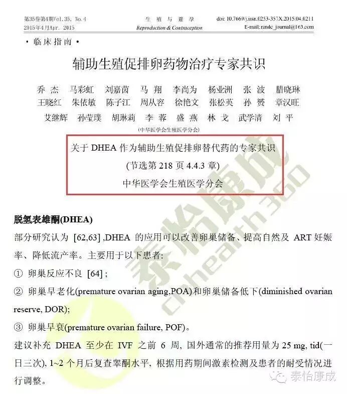 2015年4月,国内权威生殖专家就DHEA辅助生殖、改善卵巢功能、提高自然妊娠率等事项,达成共识,形成【关于DHEA作为辅助生殖促进排卵替代药的专家共识】。