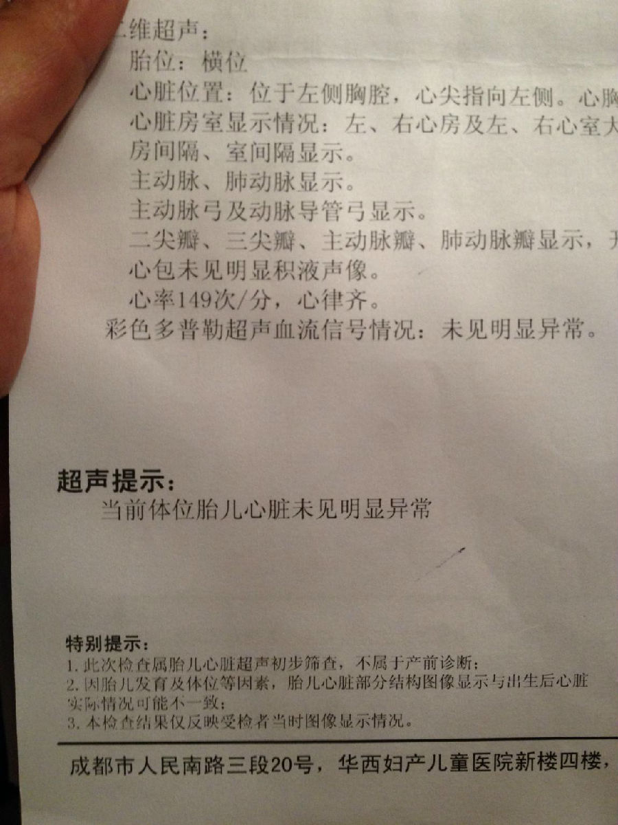 2014年5月15日上午,今天是预约做产前胎儿心脏彩超的日子,等了一上午,之前不知道华西妇二院7-1是专门针对胎儿心脏出了问题过来做复查的诊室。旁边的两对夫妻进去后出来都是愁眉苦脸的,我一问才知道,他们的宝宝已确诊为先天性心脏病。前几天放下的心瞬间又提起来了。胖妹儿捏着我的手对我说:“老公,有没有心脏病我们都不要放弃哈。我们给他医好就是了。”我笑着答应她,并安慰她我们宝宝肯定没事,但我知道我肯定笑得不轻松。“早饭(宝宝的小名),和刚刚怀上你时不同,经过这6个月的相处,你妈妈爸爸已经离不开你了,你一定要健健康康的!”胖妹儿走进诊室,我默默祈祷。