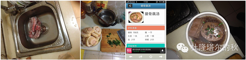 2014年1月17日。我把周围的妈妈问了个遍,得出一个结论,妊娠反应吐得再厉害也得吃东西,吃不进去就吃流食,最好就喝汤,什么汤都行。至少保证想吐得 时候得有的吐。再此特别感谢“煲汤大全”这个APP。哥第一次熬的藕汤,熬出来自己首先感动哭了,然后端到胖妹面前,她也哭了,不过是闻到味道跑到厕所去吐哭的。话说哥觉得这个藕汤不管咋个看都色香味俱全嘛。胖妹儿辛苦了···