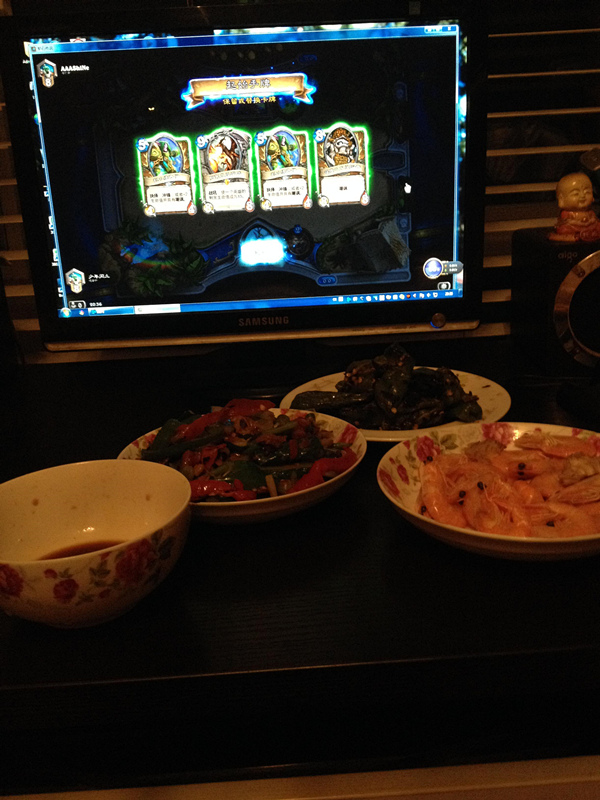 2014年7月29日。在战战兢兢中,宝宝足月了。啥都不说,游戏桌上吃一顿庆祝一下。话说我这盘炉石传说的起手感觉跪定了啊···