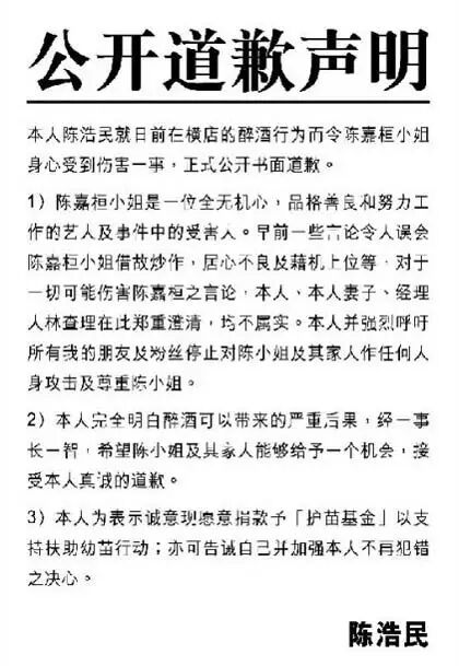 陈嘉桓的经纪公司立刻出面要状告陈浩民