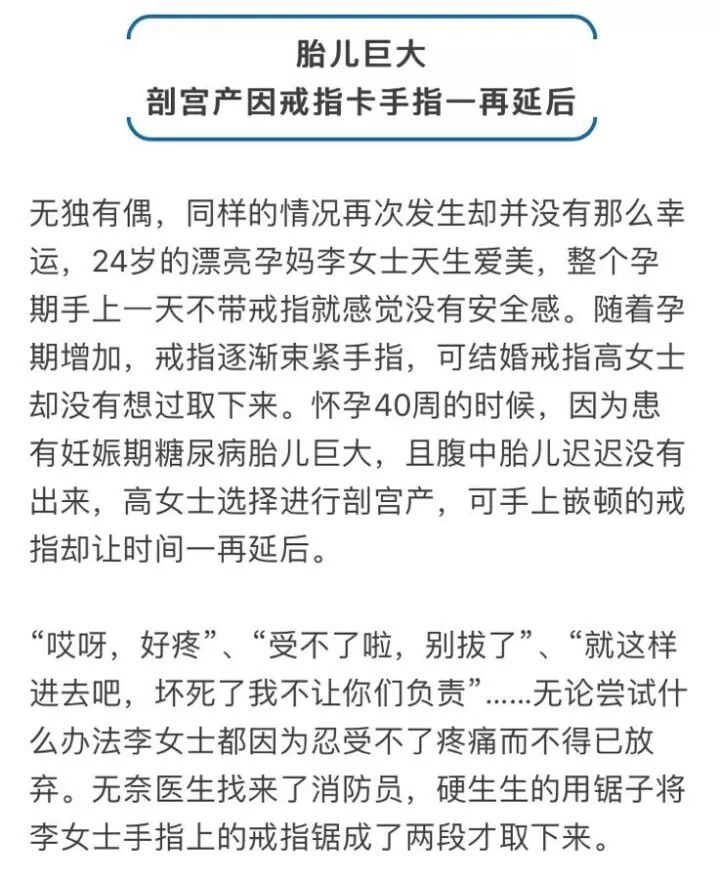 “重度子痫会导致全身浮肿,到时候戒指会阻碍血流供应导致肢端坏死,手术前非得取下来不可”,医生一边用肥皂水给王女士去戒指,一边认真的说到。在1个多小时里,医生尝试了肥皂水、油、棉线,但是均不能取下来。