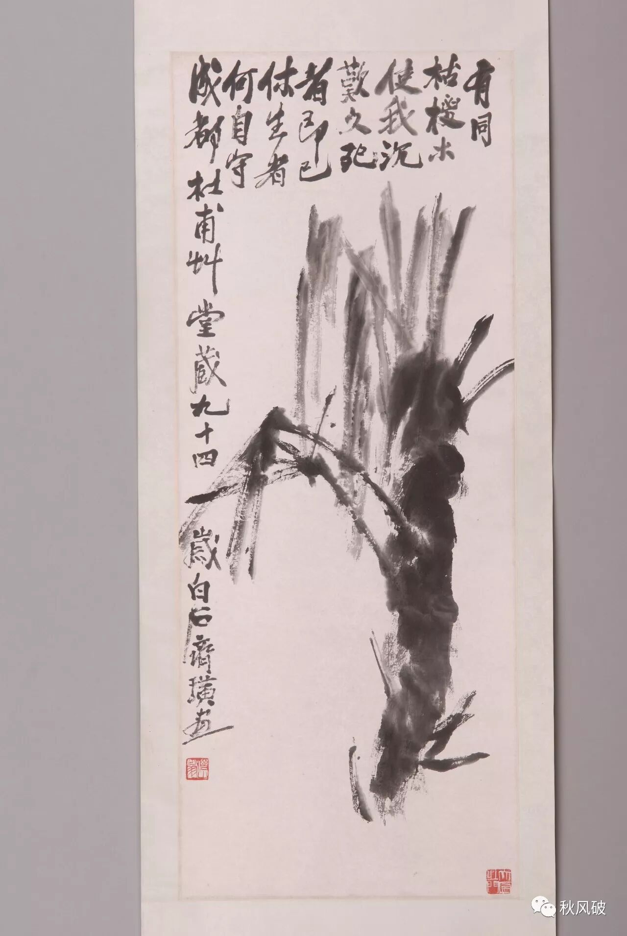齐白石94岁创作的此幅杜甫诗意画,取意来自杜甫《枯棕》:“有同枯棕木,使我沈叹久。死者即已休,生者何自守。”此画为草堂馆藏国家二级文物。