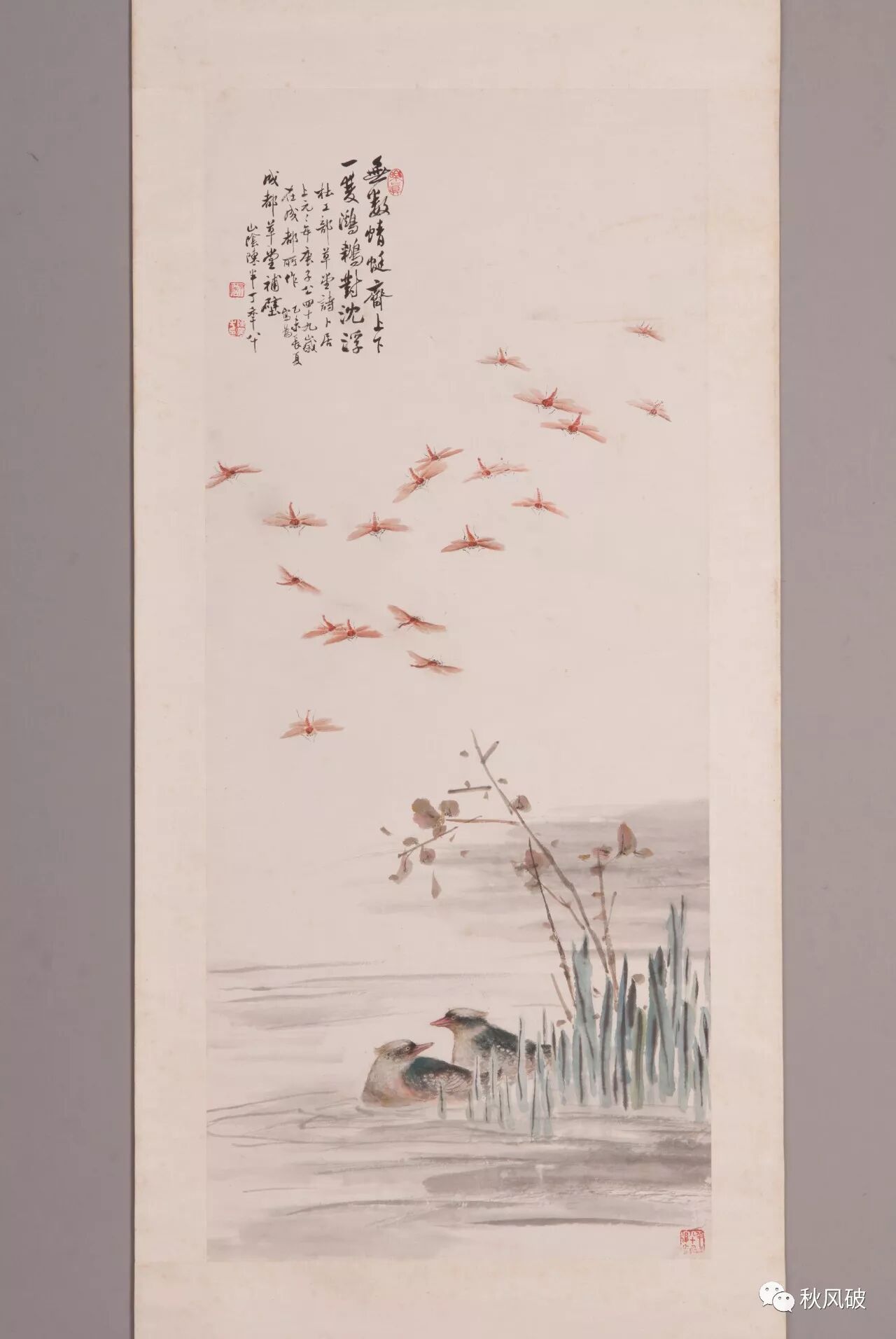 陈半丁1955年创作的此幅杜甫诗意画,取意来自杜甫《卜居》:“无数蜻蜓齐上下,一双鸂鶒对沉浮。”此画为成都杜甫草堂博物馆馆藏国家三级文物。