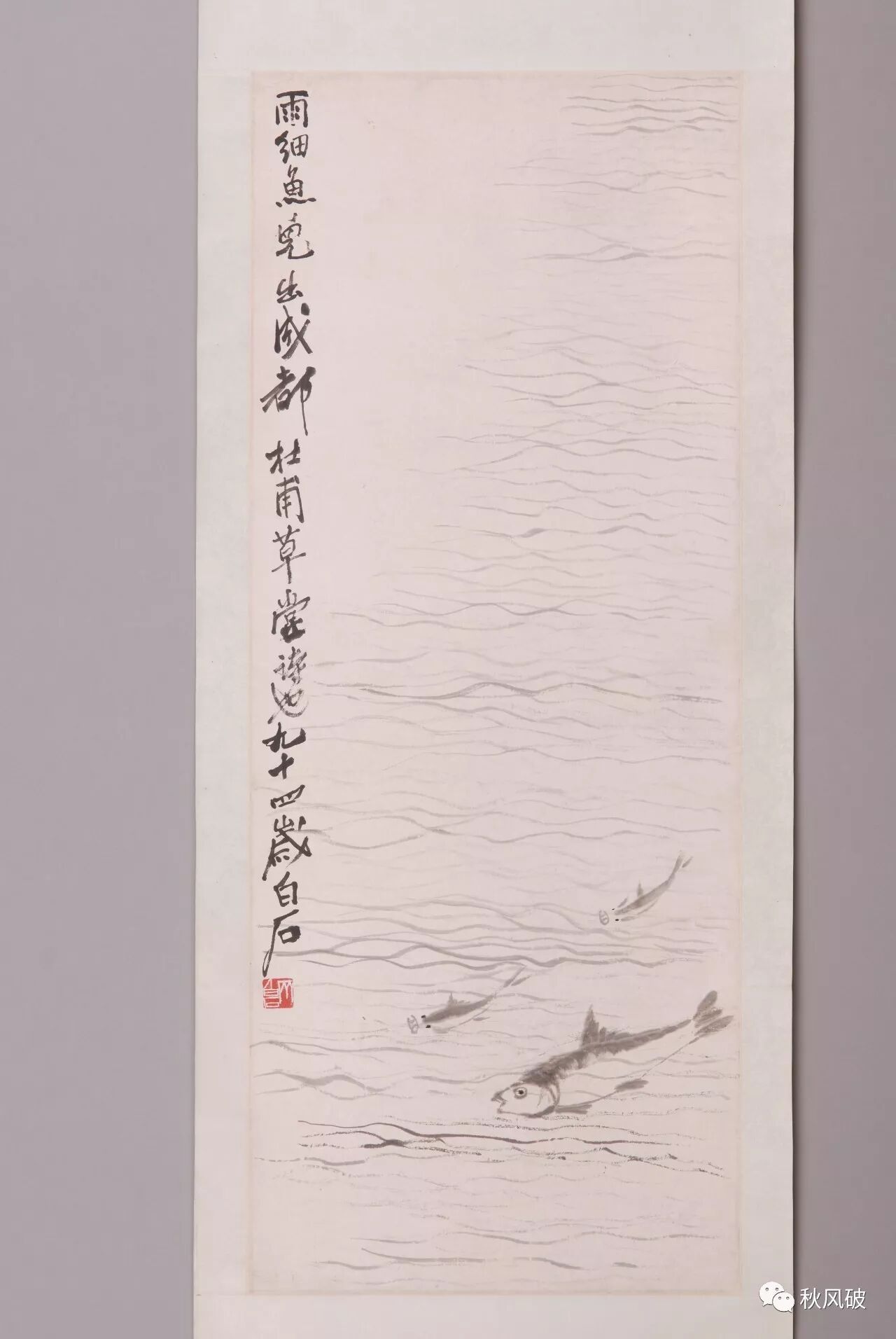 齐白石94岁创作的此幅杜甫诗意画,取意来自杜甫《水槛遣心二首》其一:“细雨鱼儿出,微风燕子斜。”此画为成都杜甫草堂博物馆馆藏国家二级文物。
