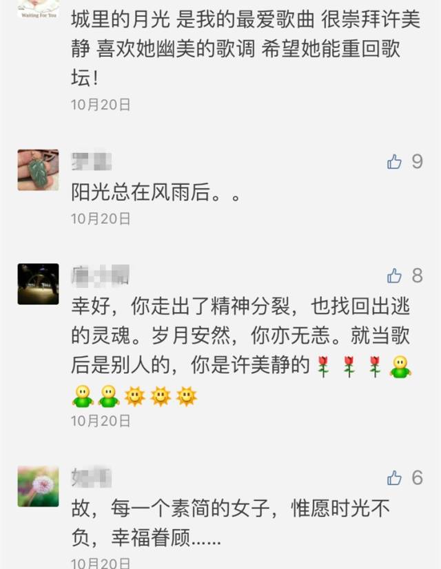 每当她唱起”红眼幽幽看着这孤城,如同苦笑挤出的高兴……“那些心碎的过往让粉丝无不落泪。烟花会谢,笙歌会停,多少人盼着那个低吟浅唱城市寂寞的许美静再回到我们身边,继续在人们的心头歌唱。