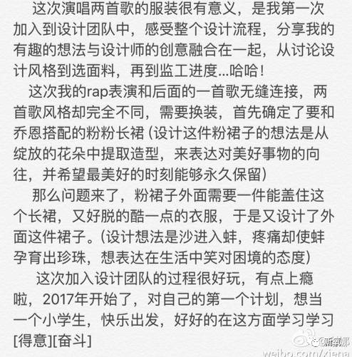 而她对于服装设计的梦想也并没有熄灭,开始尝试自己设计衣服。喏,去年跨年晚会上的这身粉红色连衣裙,就是她自己设计的。