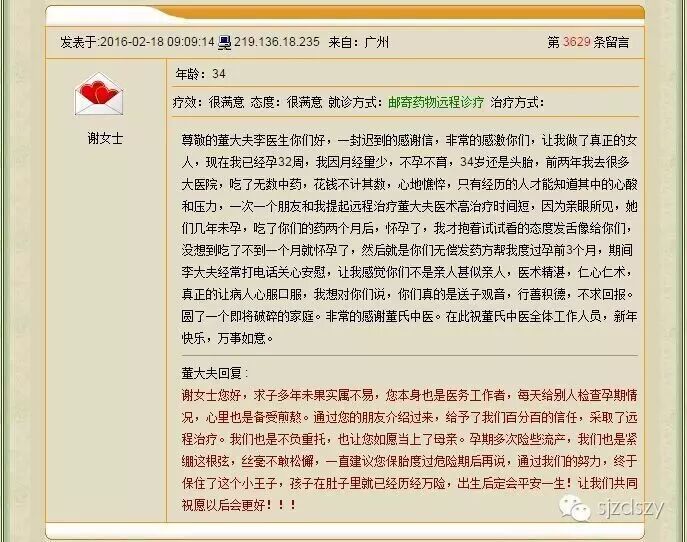 广东深圳谢女士 ,深圳龙岗某医院大夫,经朋友介绍结缘本所。问诊现年35岁, 婚后备孕多次未果,受孕后多次于60天前胚胎停育,未查出明确原因。自述26岁后出现月经量少,平时思虑过重,失眠多梦,五心烦热。一直有吃冷饮的习惯,经查彩超未见明显异常, 激素水平基本正常。分析症状及舌象淡红偏灰暗,齿痕明显,,边尖有红点,苔白,黑眼圈过重符合气虚血滞体质,并且脾虚胃弱,治疗应以益气活血,补气健脾。脾虚不能化血,经量少血虚导致,再加上寒凝体质,气血不能运行顺畅,周遭不能得到充分滋养,多半会表现出乏力,失眠,或者多梦现象。董大夫根据情况制定调经促孕丸一个月, 配合草药一同服用。服药后症状均有减轻。嘱咐排卵期可同房试孕,于两月后传来喜讯,为求孕期平安董大夫赠保胎处方服用至孕后3月余,于16年3月产下男婴,身体状况一切优良,皆大欢喜。
