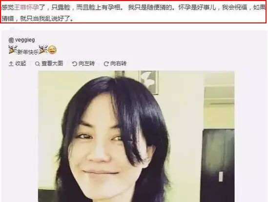 14年12月,天后发了张自拍,多名网友根据经验判断,天后脸上孕相十足
