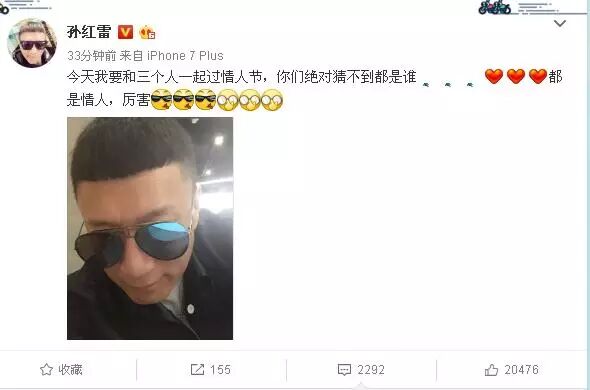 孙红雷今日发博:今天我要和三个人一起过情人节,你们绝对猜不到都是谁?都是情人,厉害。