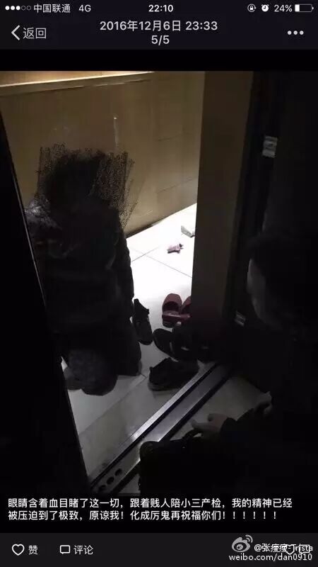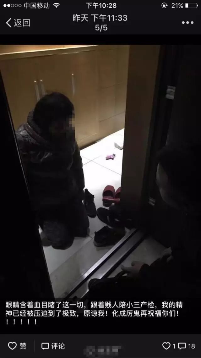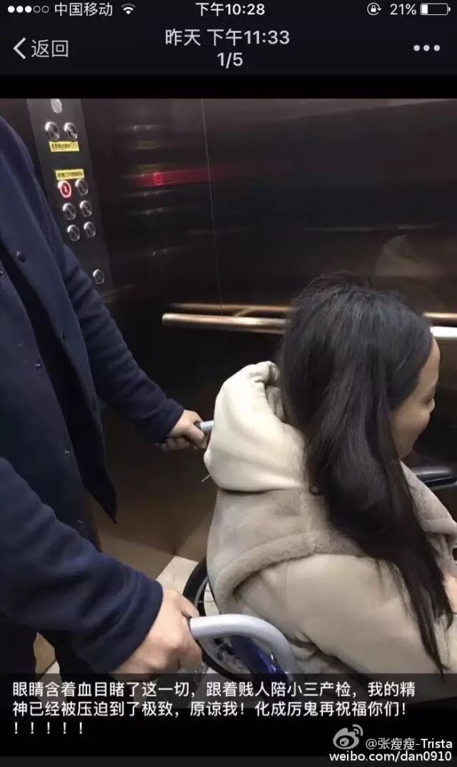 ▼小三5号晚上打电话给张烁,说自己怀了和渣男的孽种,逼着烁宝宝离婚,烁宝宝不肯相信第二天坚持同他们一起去医院产检,确定事情的真实性 (TMD,那个女的没怀过孕,做个产检居然还要做轮椅,惺惺作态,无耻至极,正如烁宝宝所说,当时的她一定是眼睛含着血看着这一幕幕)