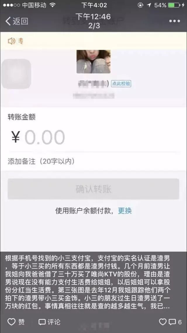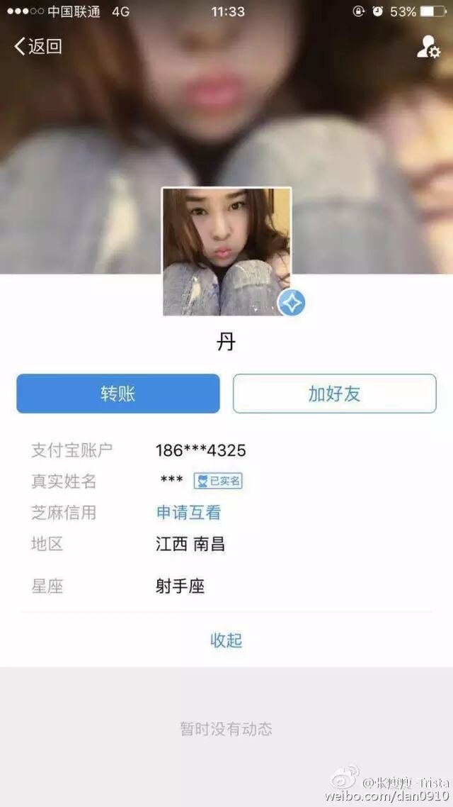 这是根据小三的电话查到的支付宝,绑定的还是渣男的实名制,可笑的是渣男天天哭穷,但是小三朋友的生日他送了一万块钱(听他们那群朋友说的,还只是三的朋友)