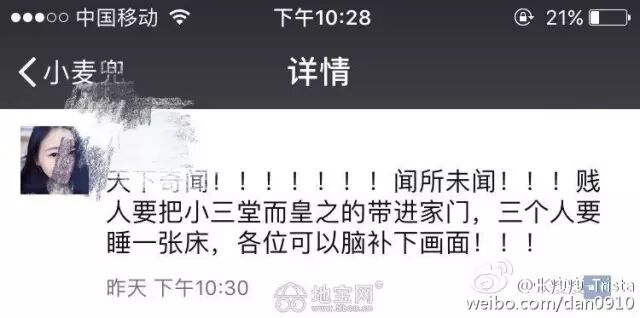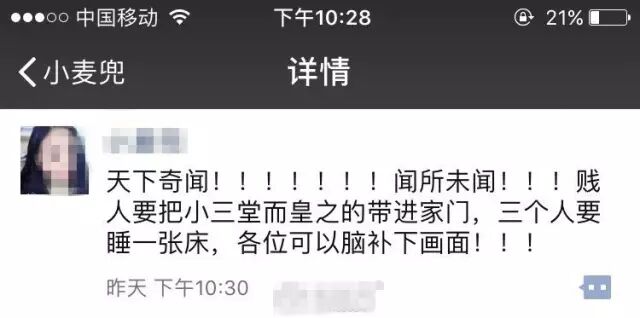 事情发生到这里,这两天我把小三所有信息都查出来了,也发了很多朋友圈,姐姐的朋友把这件事整理了一下发去了南昌地宝,浏览量已经达到了六十多万,里面po了小三和渣男的微信,很多人加了小三,精彩的是小三和每个加她的人说自己是无辜的她什么都不知道啊。是啊全世界的小三你最棒,给你鼓掌好不好~~~