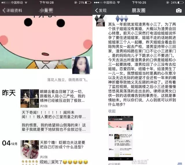 ▼左为受害者朋友,右为受害者亲属朋友圈