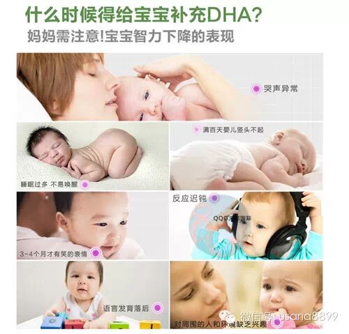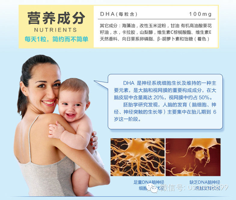 怀孕期间,若母体缺乏DHA,会影响胎儿的脑细胞和视网膜的生长和发育,产生弱智儿和弱视儿。有效促进婴幼儿大脑、神经系统和视网膜发育,提升其智力和视力。