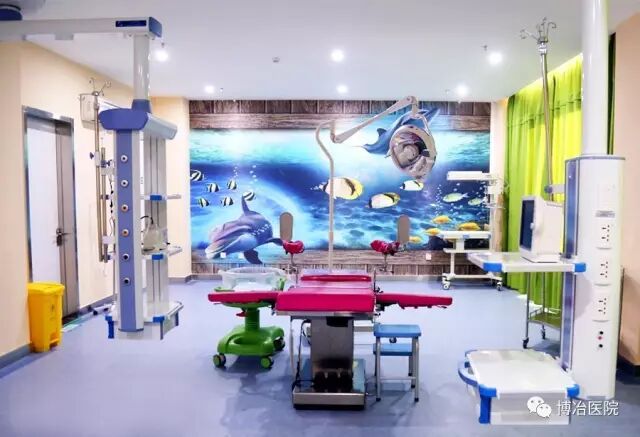 Δ博冶中医院产房环境整洁安静,色调温馨,通风良好,室内采光、墙面地面装饰符合卫生学要求,海洋背景图案,有效缓解产妇紧张情绪。