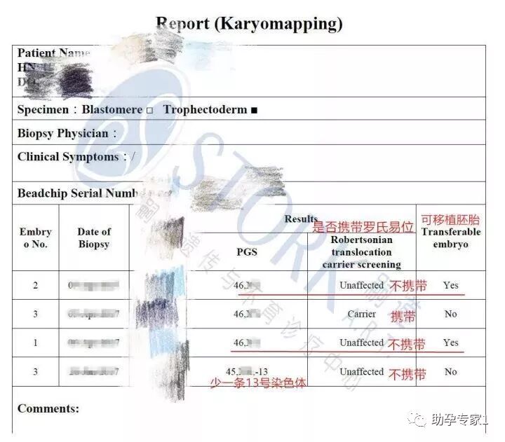 虽然H女士的卵巢功能衰退衰退,卵子质量也不好,两次促排取卵10个,受精了7个,但是最后养成了4个囊胚。并且,四个囊胚经过Karyomapping(核型定位)芯片检测后,达到其他生殖中心/医院可移植标准的胚胎(染色体罗氏易位胚胎和正常胚胎)有3个,其中有2个胚胎是染色体正常胚胎,即不携带罗氏易位。