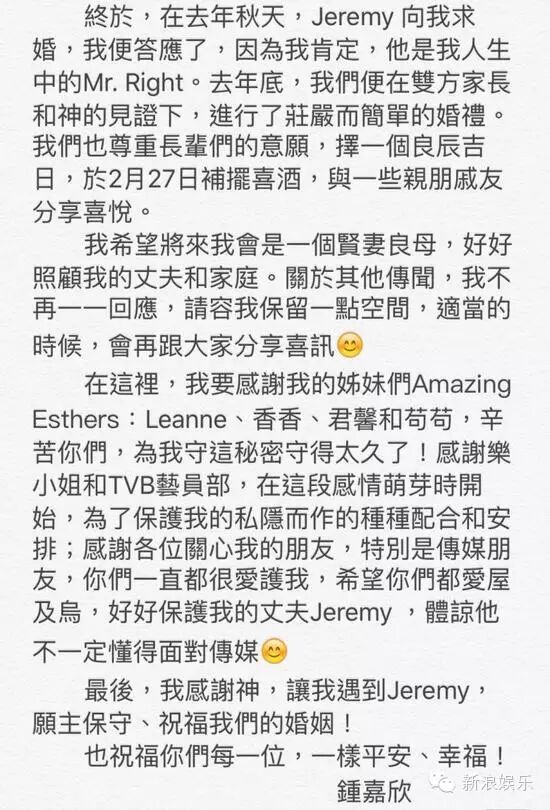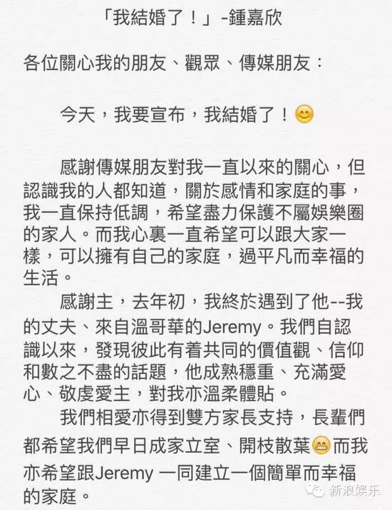今儿下午,钟嘉欣自儿发了篇千字长文,承认自己确实结婚了!