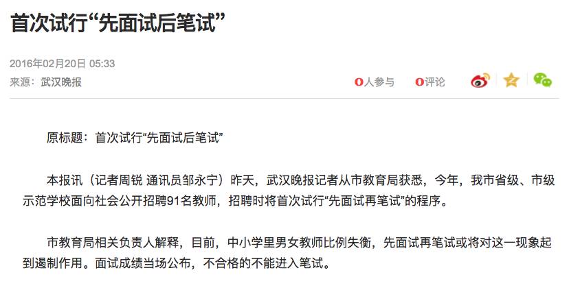 甚至在2016年,武汉为了保证教师招聘中笔试成绩不如女性的男性求职者能被录用,实行“先面试后笔试”的制度,并直言就是为了控制性别比例。