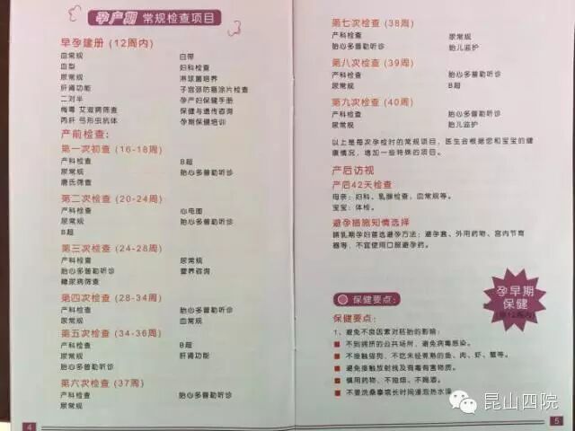 孕期可在昆山市内各医院检查,但2016年1月1日起,《昆山市孕产妇健康管理免费服务券》只能在二级及以下公立医疗机构及社区卫生服务中心使用,昆山市第一人民医院(友谊院区)及中医院不接受使用免费券,孕妇不能享受相应的免费服务。而我陆家辖区可在邵村卫生服务中心、合丰卫生服务中心(孕28周内)和昆山第四人民医院进行孕期检查。