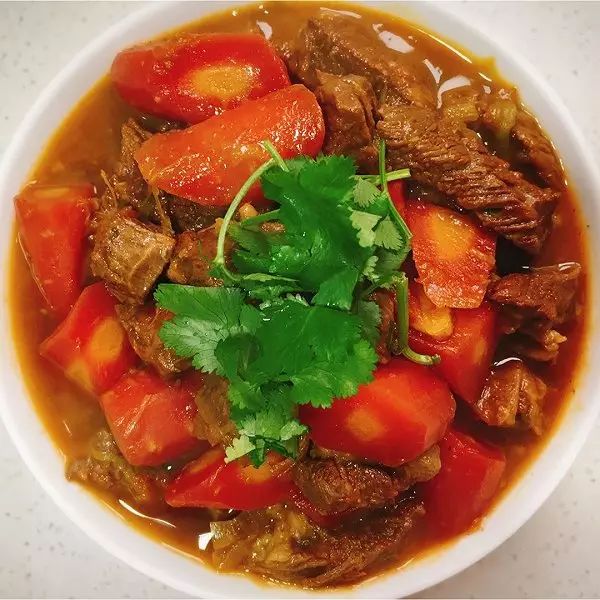 番茄炖牛肉:牛腱子肉、胡萝卜、洋葱切块,蘑菇切片备用;在锅中加入少量油,依次放入洋葱、胡萝卜、蘑菇、番茄拌炒,再加入牛腱翻炒,加入水焖煮30分钟,调味。