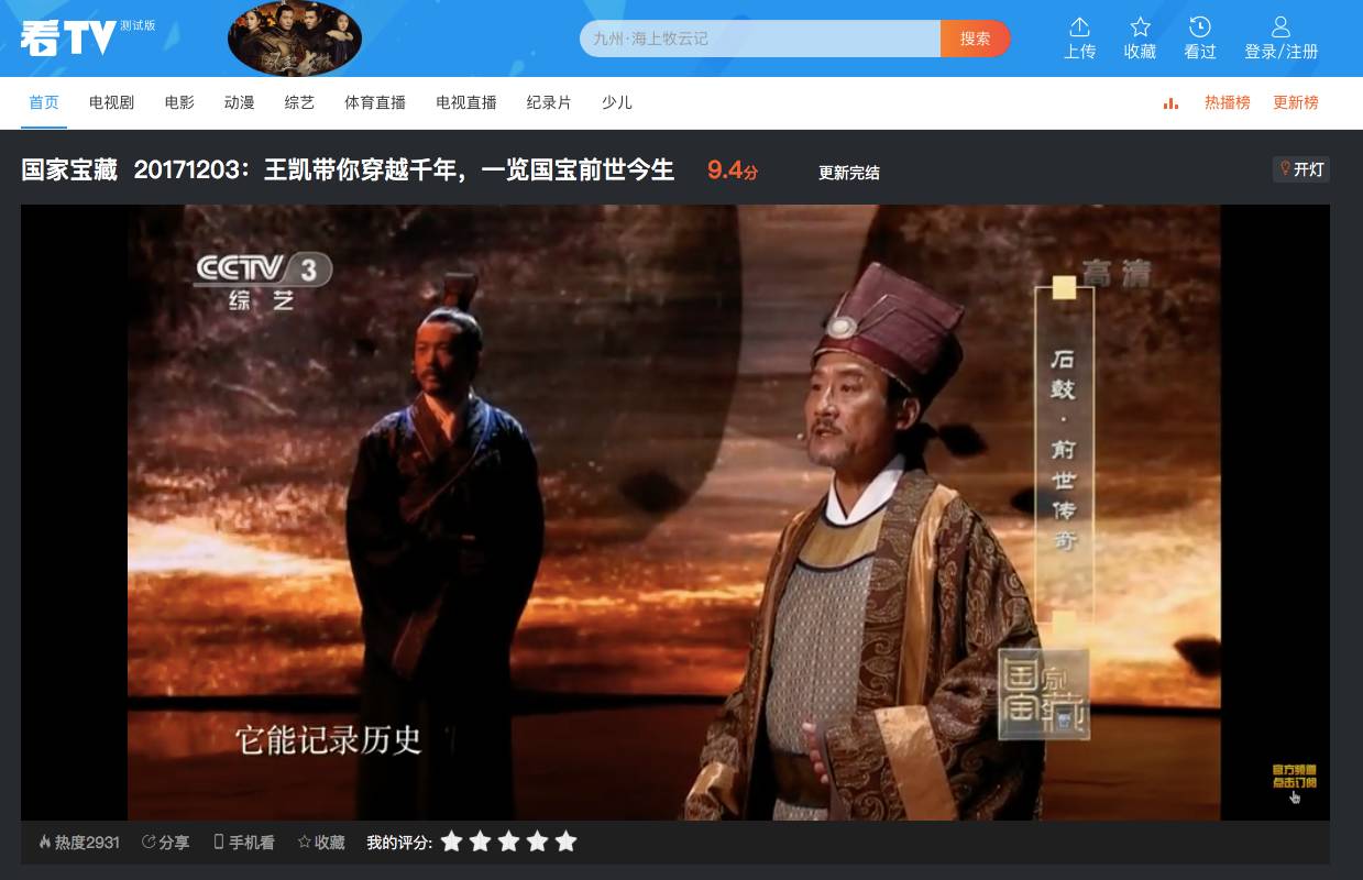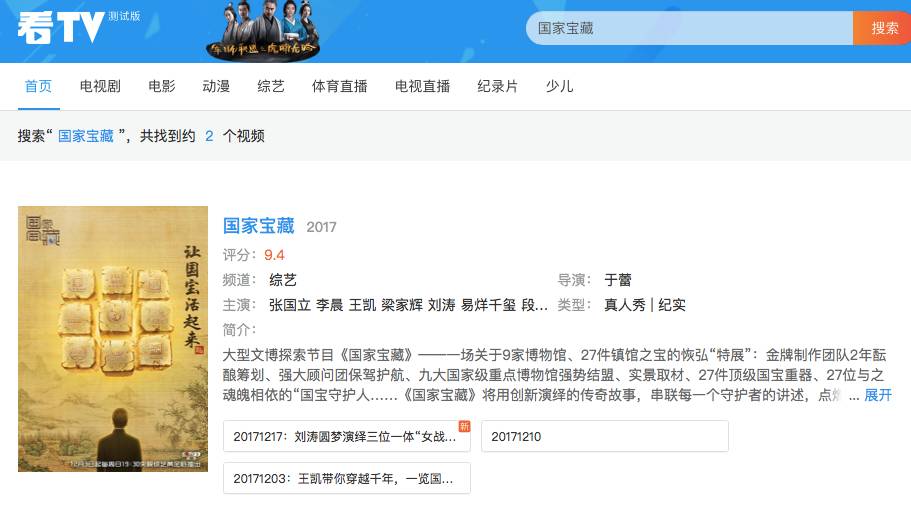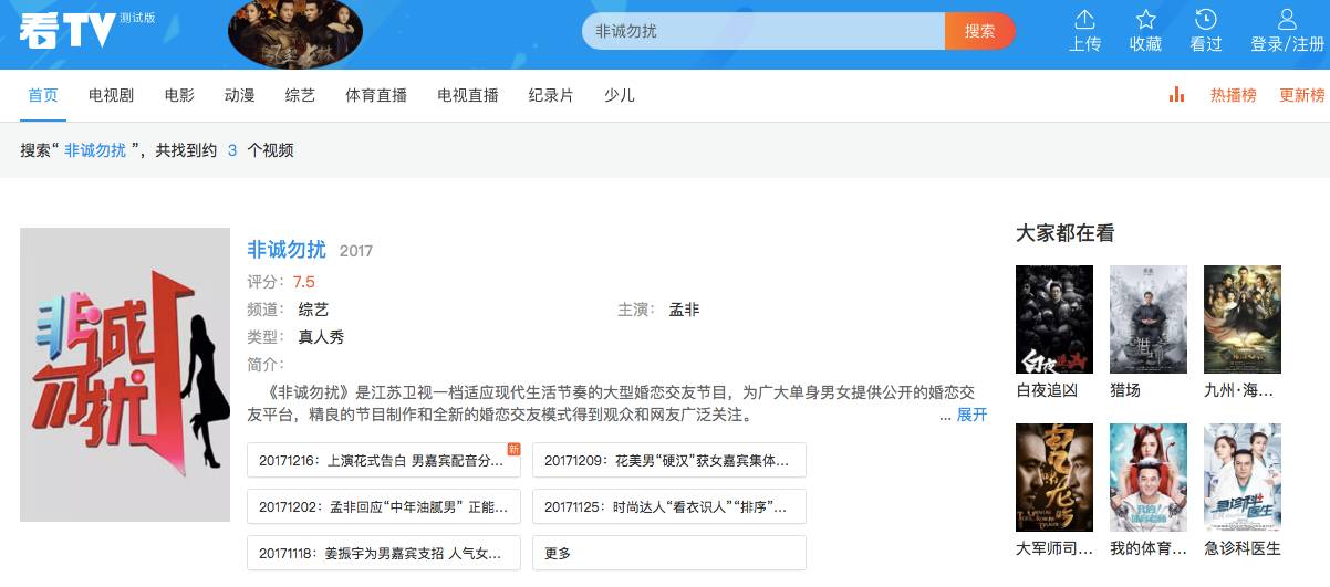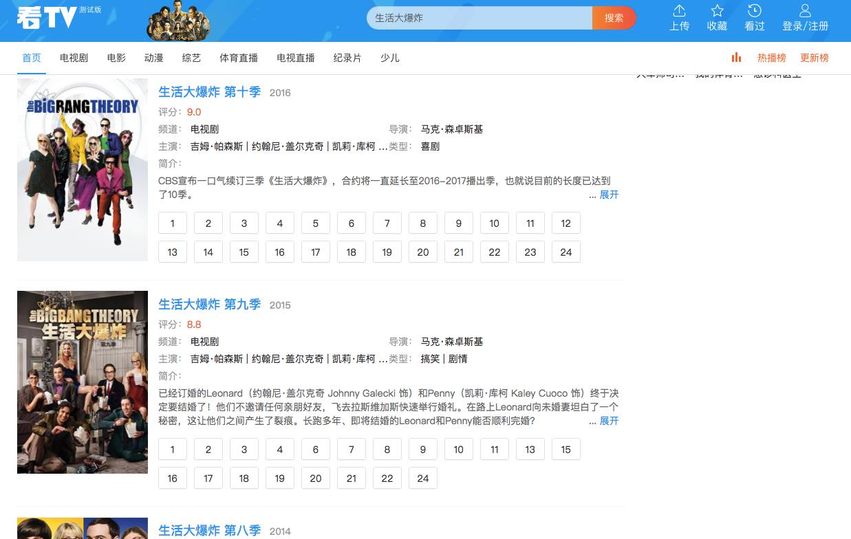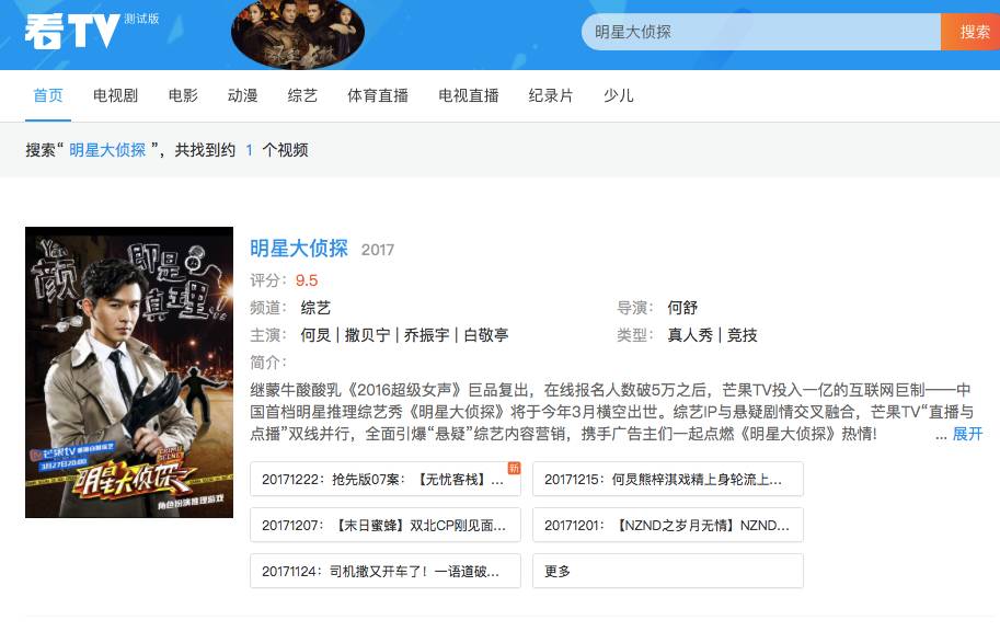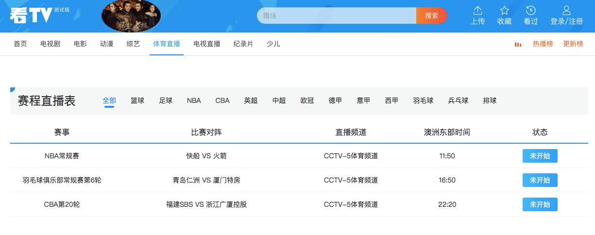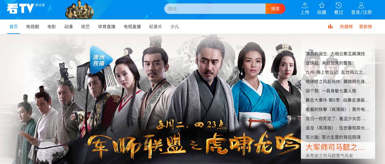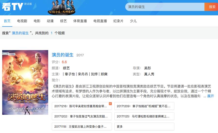 打开看TV的网站,第一感觉是分类详尽明了,除了上面提到的综艺、电视剧、电影之外,还有电影、动漫、电视直播、体育直播等: