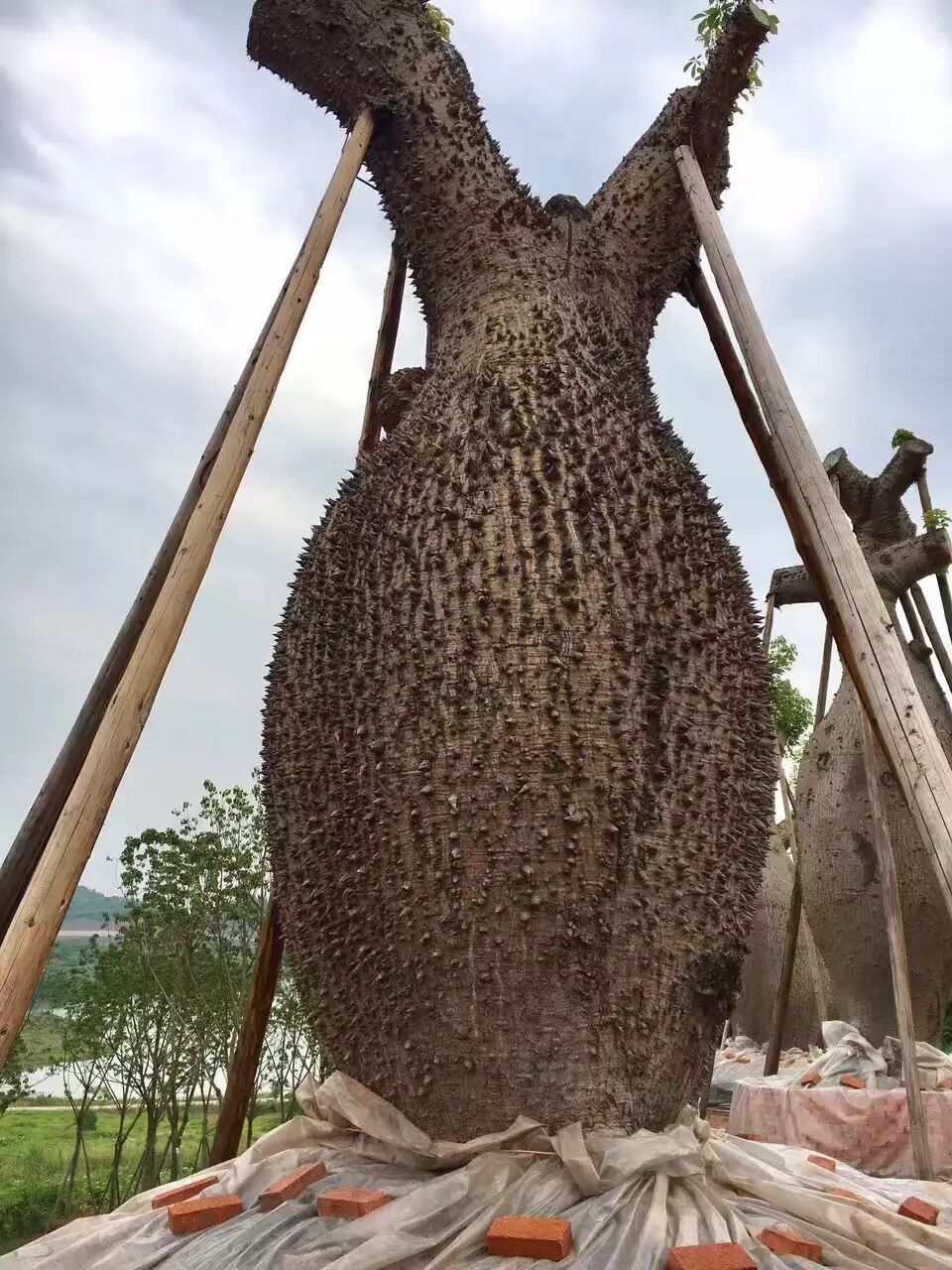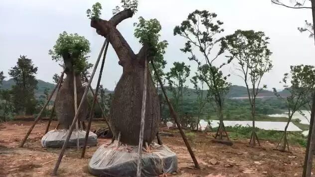 经网友查询得知,此为纺锤树,别名也叫瓶子树、酒瓶树、佛肚树、萝卜树。生长在南美洲的巴西高原上,远远望去很像一个个巨型的纺锤插在地里。纺锤树有30米高,两头尖细,中间膨大,最粗的地方直径可达5米,里面贮水约有2吨。