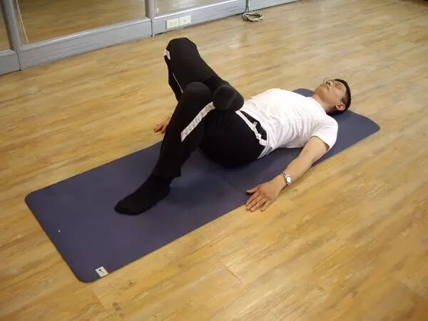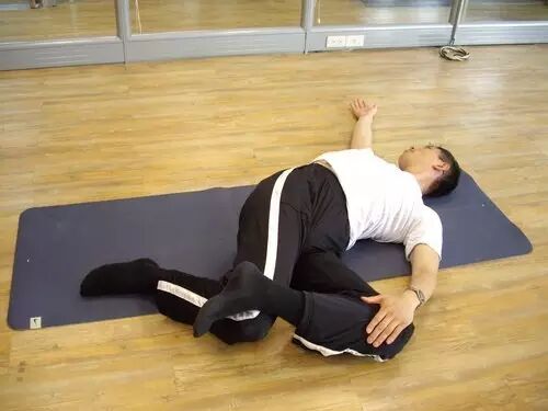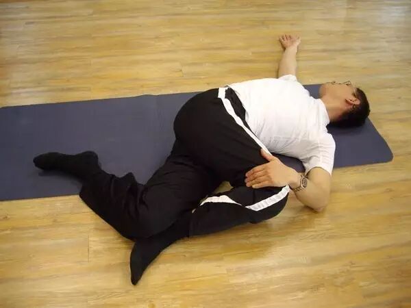 回到左脚放在右膝上的姿势。保持这个姿势的同时向左侧躺,左手压住左腿膝盖内侧。