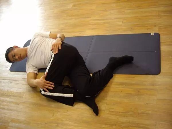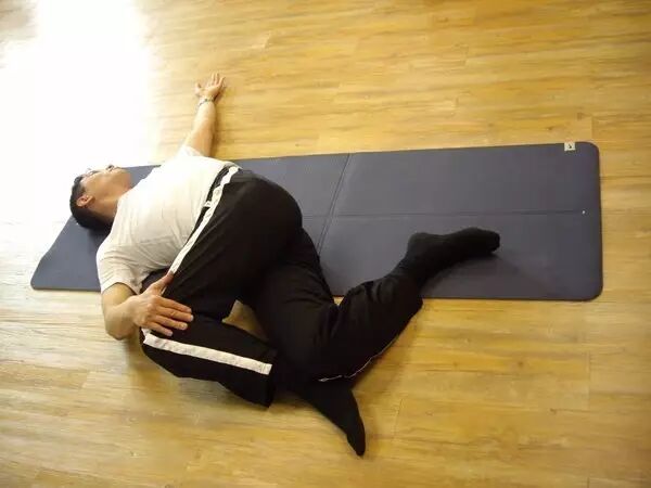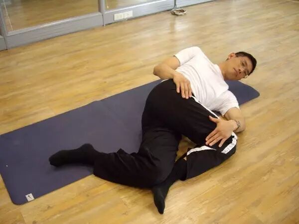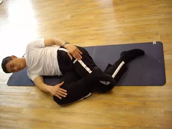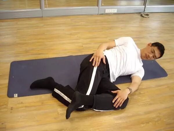 维持这个姿势的同时向左侧躺,右手压住左脚膝盖外侧。