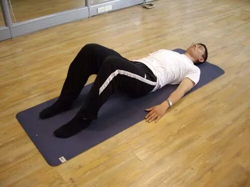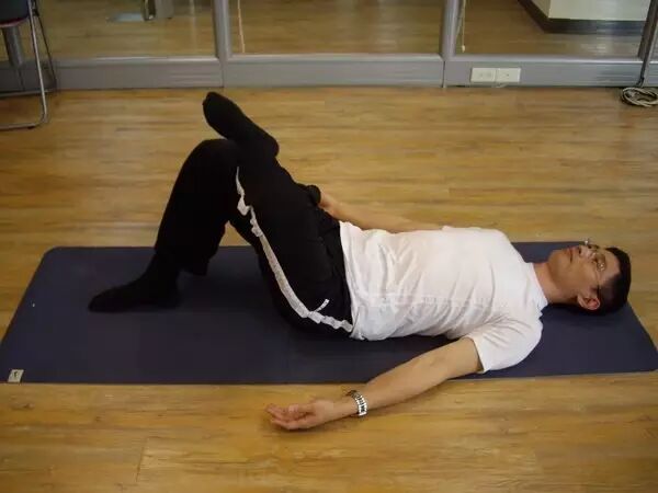起始式:仰躺,膝盖弯曲使小腿与地面呈45度,双脚与肩同宽。