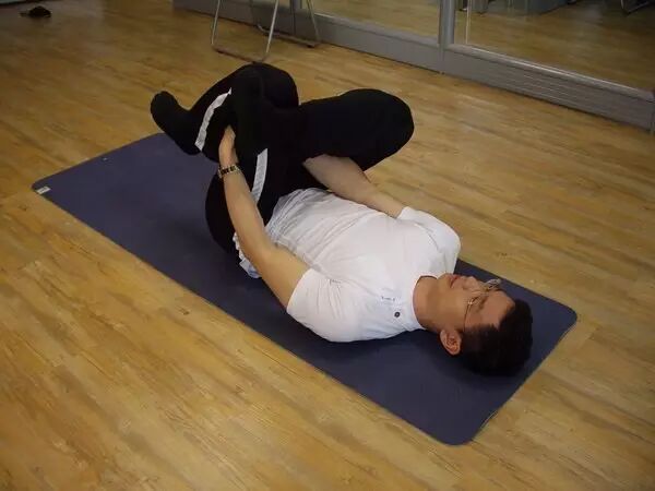 左手穿过左脚,和右手合抱左大腿,向自己的身体靠近。此时左臀会有伸展牵拉的感觉。保持这个姿势1-2分钟。