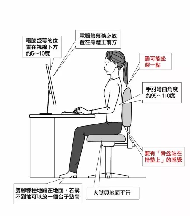 坐着的时候身体的重心要放在坐骨上,保持腰背挺直,肩膀放松,小腿垂直地面。