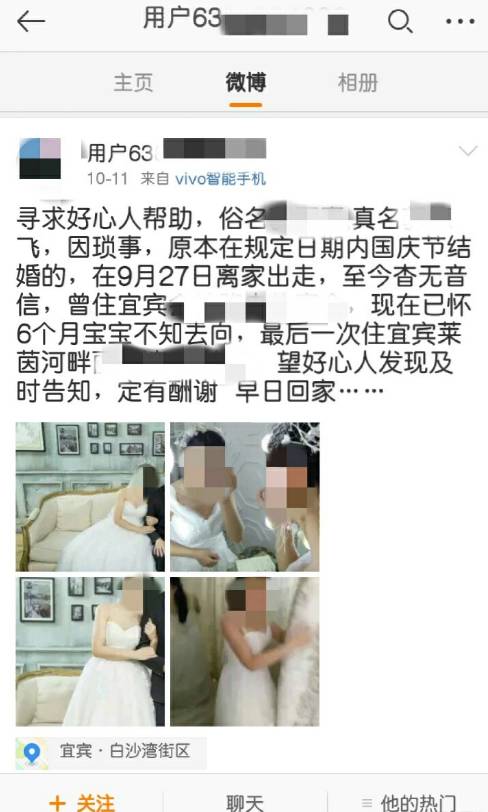 可是,9月27日,罗先生和郭女士突然闹翻,当天晚上郭女士便不辞而别。此后,郭女士不再愿意面对罗先生。10月3日,原是婚宴开席的日子,新娘却“落跑”了,罗先生不得不向亲朋好友一一致电表示“婚礼延期举办”。罗先生在微博上发布消息寻找女友。