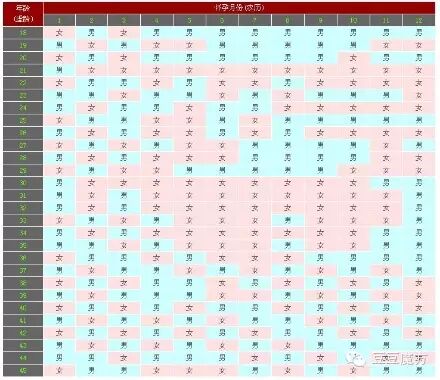 以下是一份清宫珍藏的生男生女预测图(表),女性年龄是以农历虚龄(即真实年龄加1岁)算,而怀孕月份即是受孕的那个月份,当然亦是以农历算.