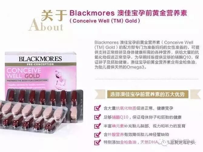 很多妈妈对DHA的认识通常体现在对奶粉的选择上,对于怀孕期间的补充却是不足够。其实宝宝的大脑细胞有百分之七十是在孕期完成,而剩下的百分之三十是在出生后3年内基本完成。Blackmores孕妇黄金素里额外含有DHA,这对于宝宝的脑部及视力发育必不可少。