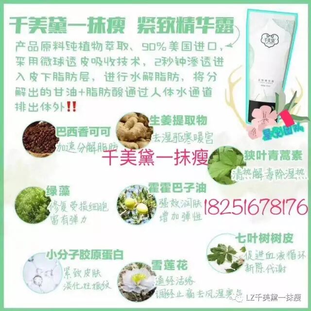 千美黛一抹瘦的成分非常安全,功效是深入肌底调理肌肤,协同把多余水分和脂肪排出去。肥胖人群更有这种需求。然后,提升紧致肌肤,改善纹理,令肌肤水嫩有弹性。