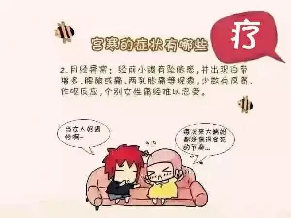 1、痛经,来月的时候有血块,月经颜色黑等症状,这些是比较明显的宫寒症状。