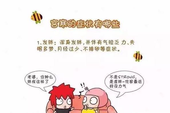 6、发胖。宫寒者的另一表现是腰腹肥胖,并伴有气短乏力、失眠多梦、月经过少、不排卵等症状。子宫热量不足,为了维护自身的生理机能,脂肪就充当起“护宫使者”,子宫越冷身体就越需要囤积脂肪,从而引起发胖。
