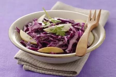 1、紫甘蓝切丝,放到一个干净的容器里里,加白醋和盐适量,腌一周左右。吃之前加白糖,辣椒油,吐司丁拌匀即可