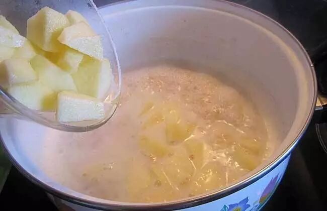 7、烧沸后再改用中火炖至牛肉松软,土豆散裂,加入洋葱片和精盐;
