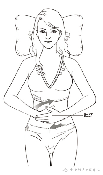 (2)双手掌重叠,围着肚脐摩腹,顺时针按摩7或9圈,让腹部先天的生命圆运动重新顺畅地运转起来。