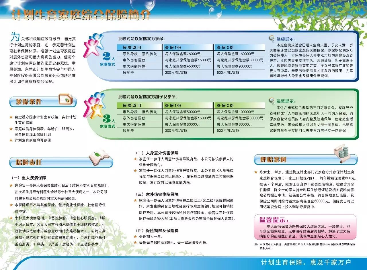 为进一步完善计划生育社会保障体系,东莞市计划生育协会与中国人寿保险公司联合推出计生家庭综合保险。该项目是计生保障体系中的一项福利政策,可以增强计生家庭抵御意外伤害和重大疾病的风险,使每个符合计划生育政策的家庭安心无忧、幸福美满。