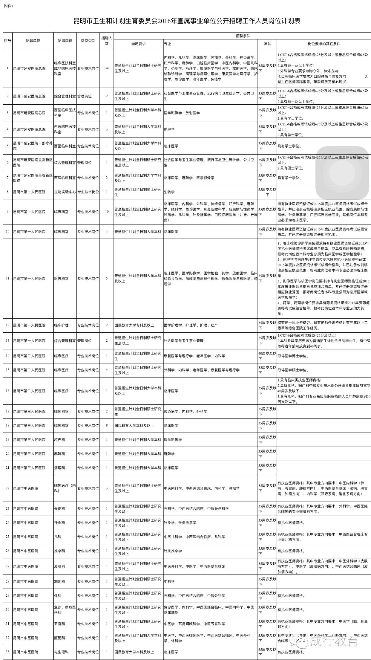 1.《昆明市卫生和计划生育委员会2016年直属事业单位公开招聘工作人员岗位计划表》